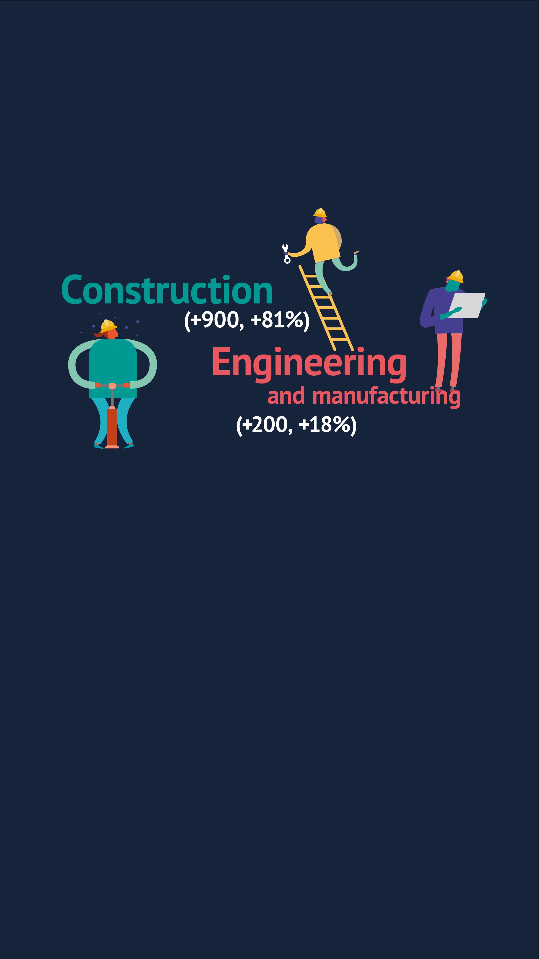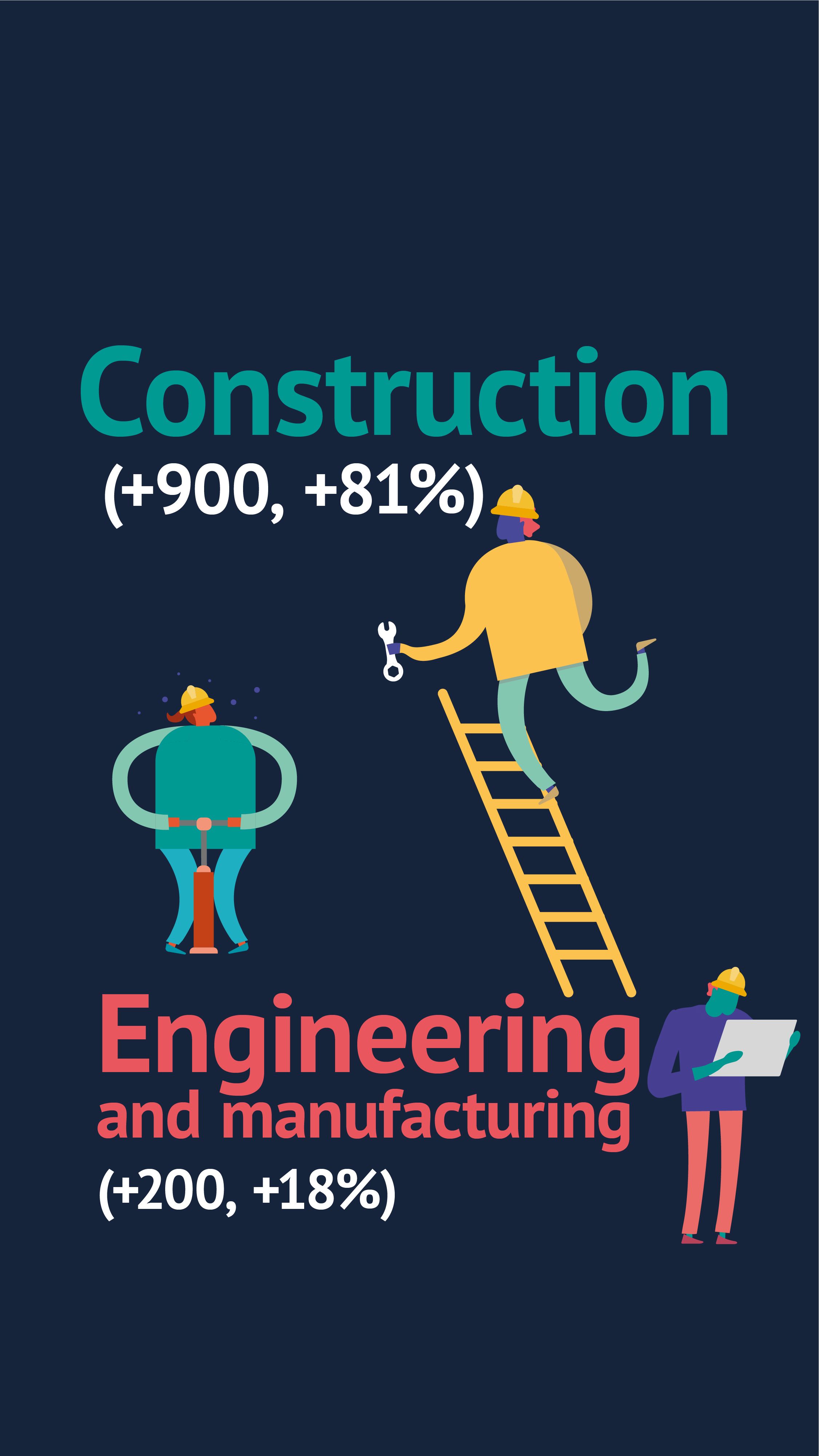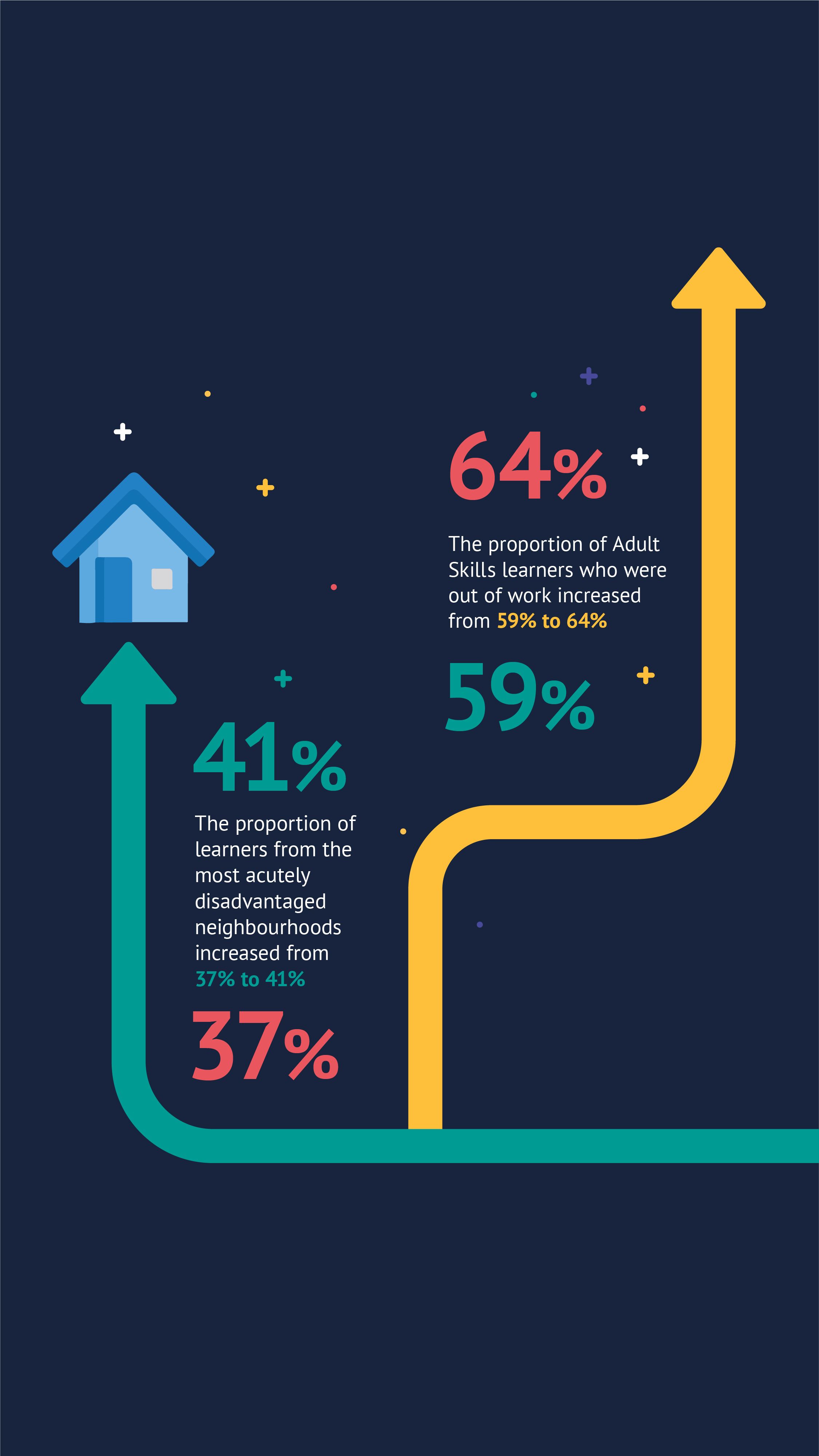 Increased study in areas where we know there are skills shortages; including Digital, Construction (+900 learners, +81%), Engineering and Manufacturing (+200 learners, +18%)