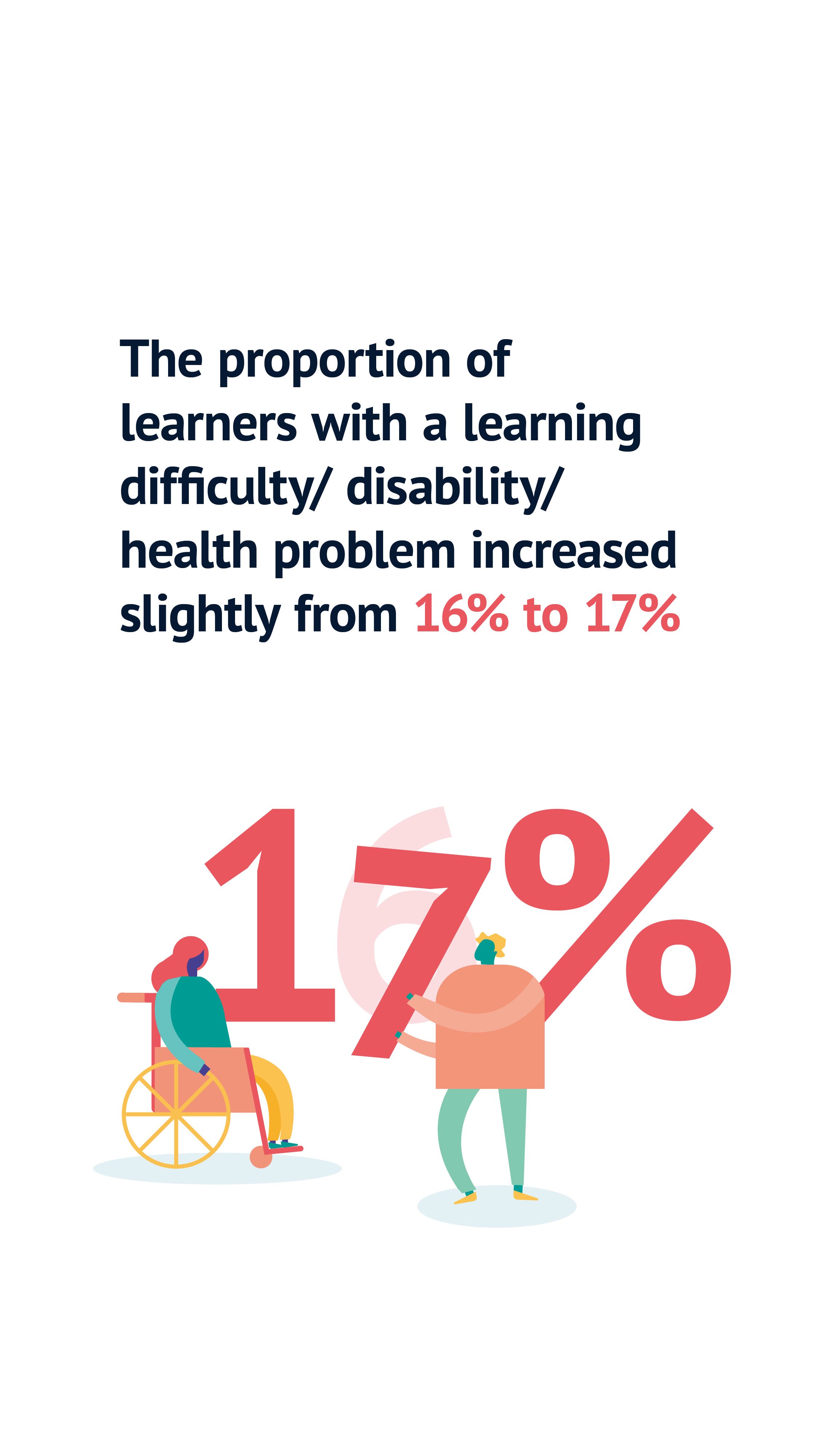 The proportion of learners with a learning difficulty, disability or health problem increased slightly in 2021/22 compared with the previous year, from 16% to 17%. This was due to an increase of two percentage points for Community Learning from 20% to 22%; the Adult Skills proportion remained the same.