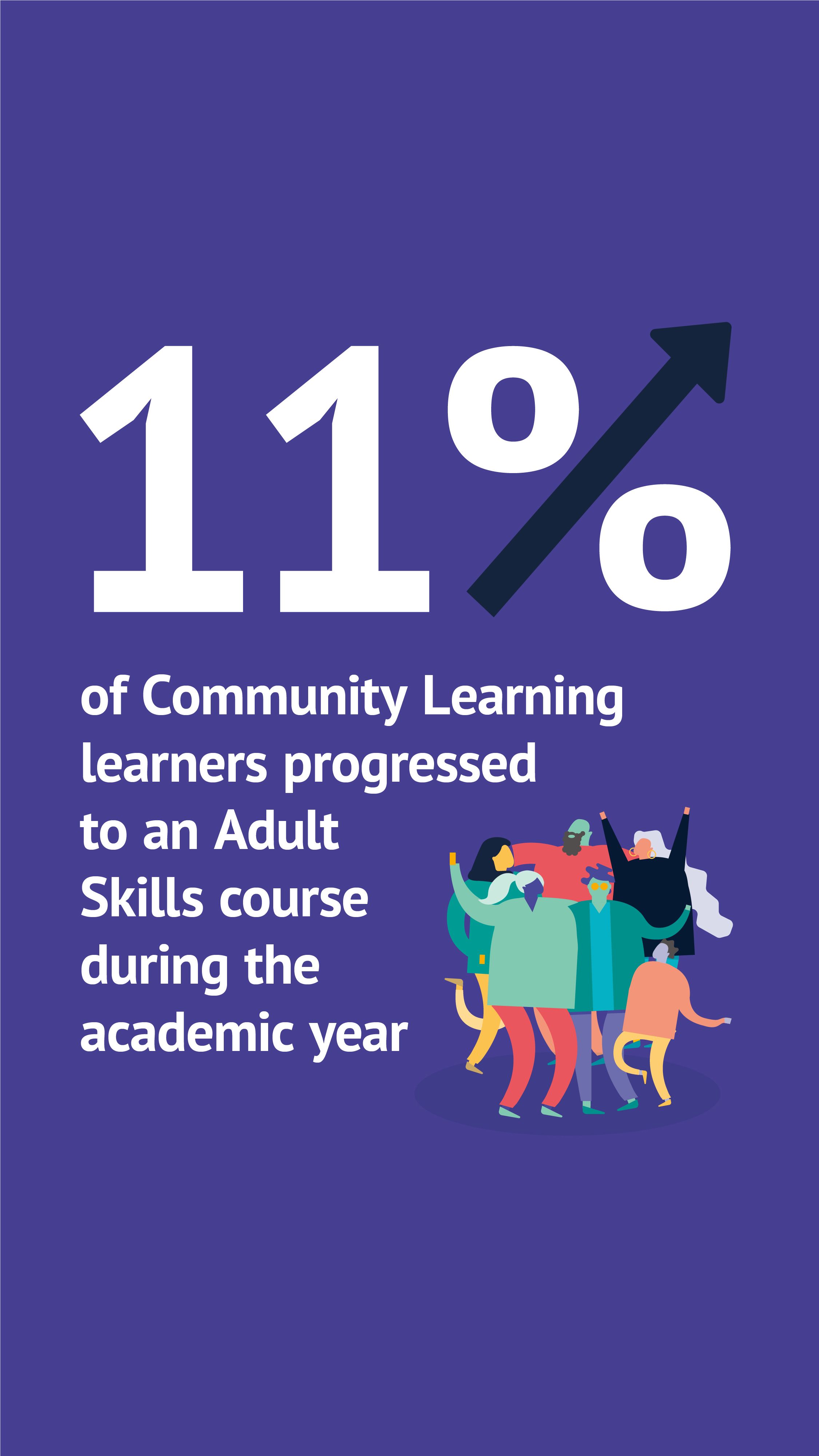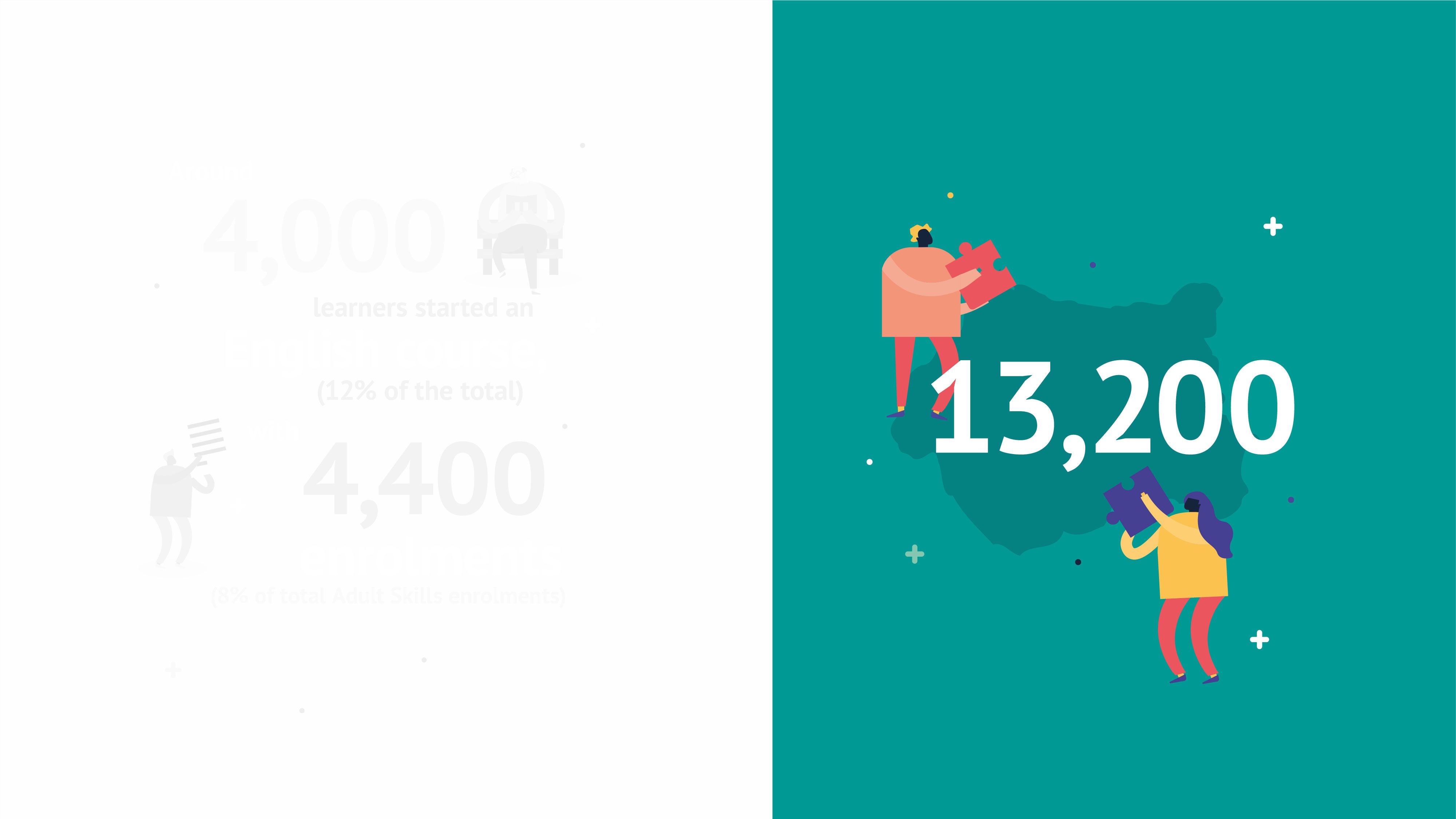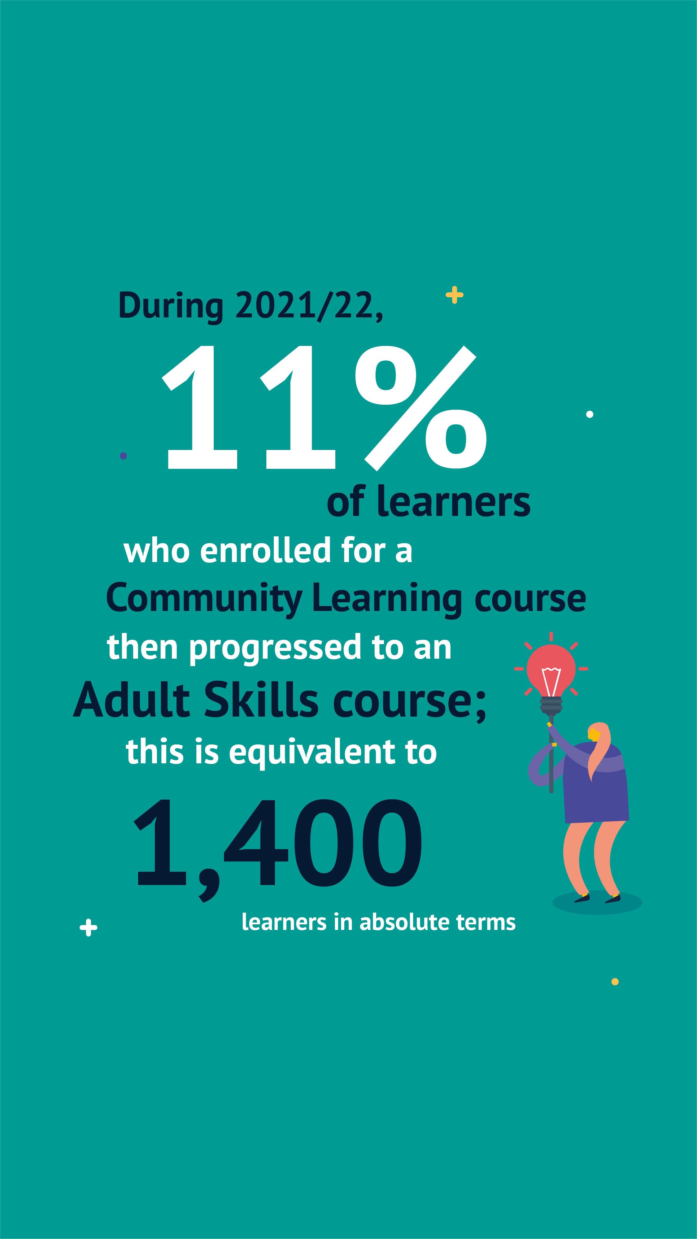 Just over 6,000 learners achieved their first GCSE equivalent through the Adult Skills programme in 2021/22, whilst 700 learners achieved, their first A level equivalent. This supported them to gain the qualifications they weren't able to achieve at school or in full-time education.