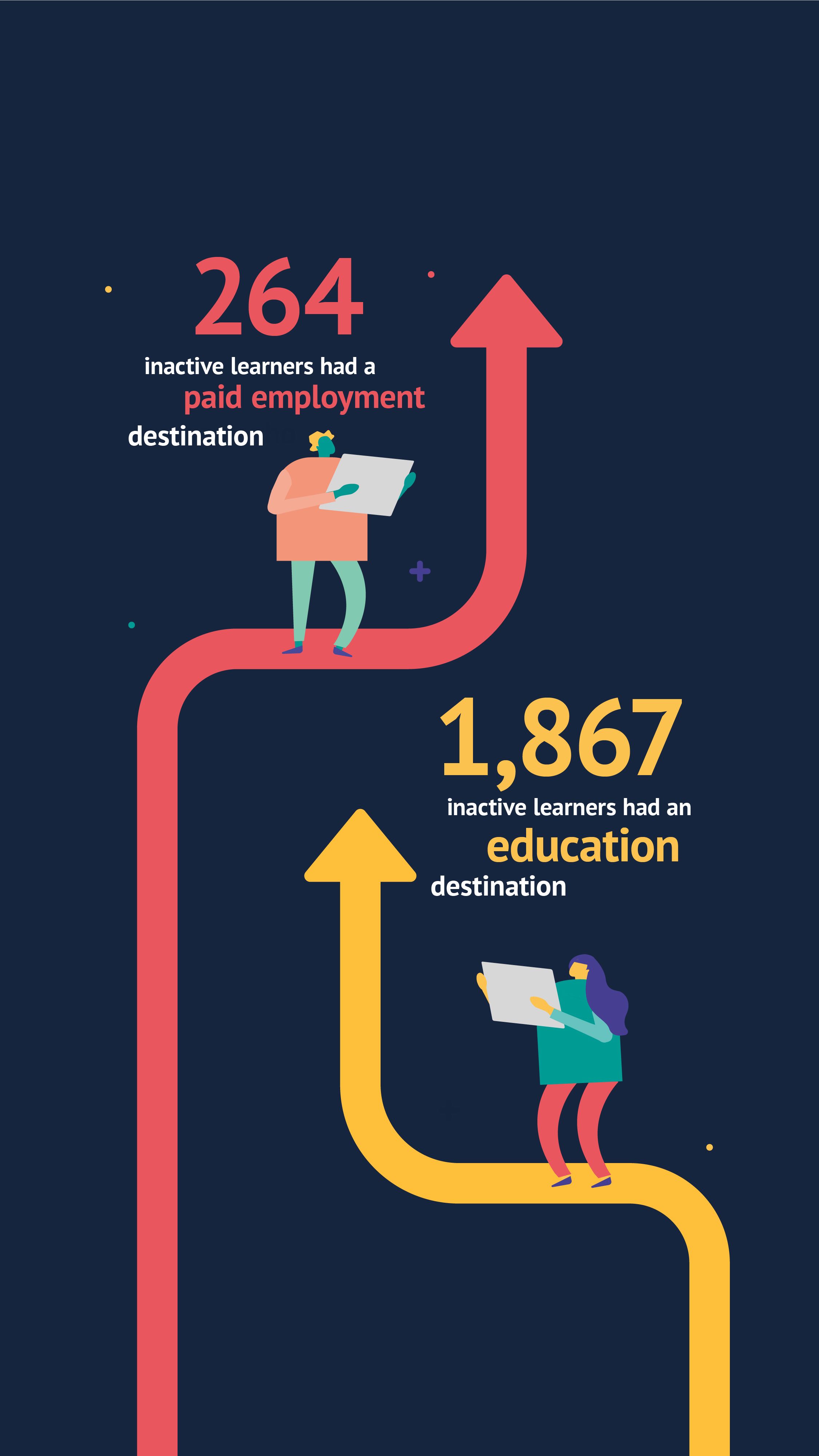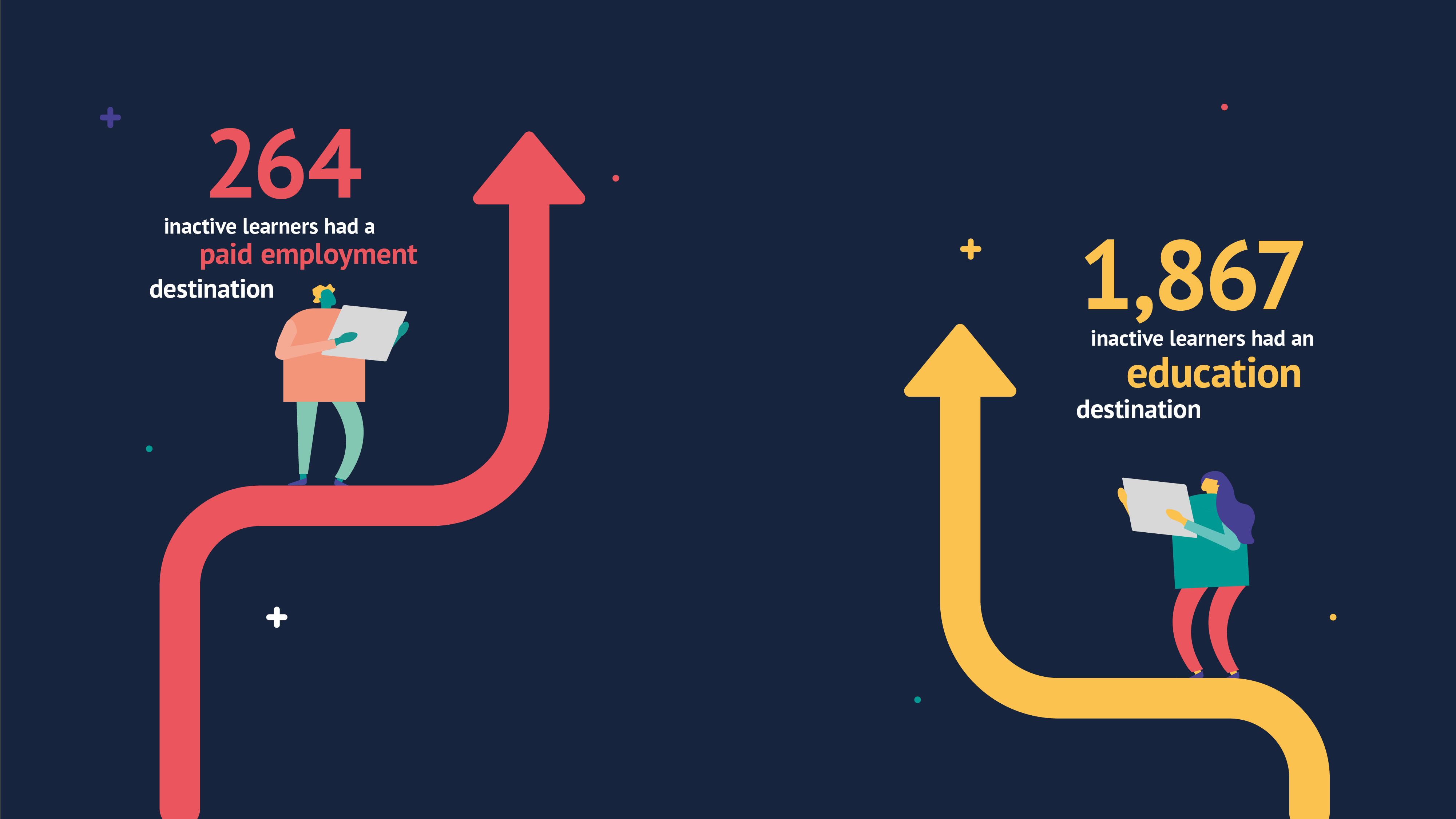 264 (5%) inactive learners gained paid employment whilst 1,867 (35%) went on to education